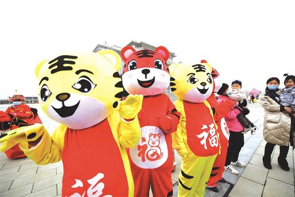 2月15日,幾名工作人員身穿萌虎造型服裝向市民招手。當日,由市文化廣電和旅游局主辦,市文化館、市美術館、市圖書館承辦的“我們的節(jié)日‘元宵節(jié)’——周口市群眾文化系列活動‘寅虎賀春鬧元宵’”在市文化藝術中心舉行。
