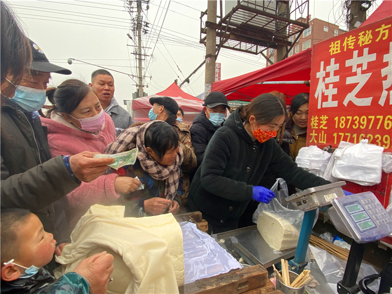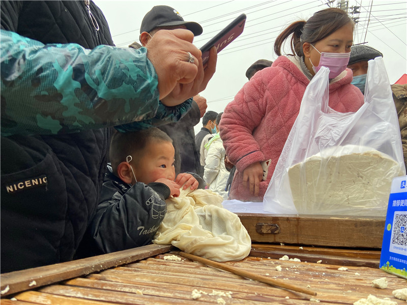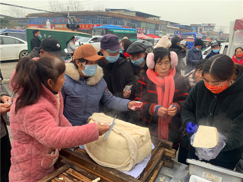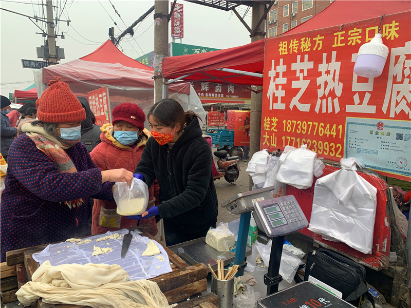 在固墻鎮(zhèn)的集市上,“桂枝熱豆腐”攤位前的顧客絡(luò)繹不絕。“給我來50塊錢的豆腐”“我要20斤,先給我切豆腐吧”“我要30斤,多少錢”……人群將豆腐攤里三層外三層圍了起來,從人群外朝里看看不見豆腐,只看到豆腐攤里冒出來的團(tuán)團(tuán)熱氣?!暗攘税雮€(gè)小時(shí)了,剛才那一盒豆腐沒輪到我就賣完了,這才搶到手?!备浇拇迕駰畲鬆斈弥鴦傎I的豆腐高興地說?!拔覐穆挂貋淼?,姐姐在里面擠著買豆腐,我在這兒等她呢?!?歲的張家瑞說,她每年放寒假都會(huì)和家人一起到固墻來探親,過年的時(shí)候逛逛集市,順便買些豆腐帶回鹿邑。