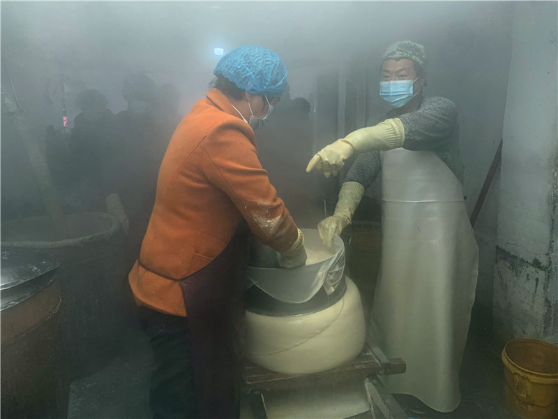 一家三代經(jīng)營的老朱家豆腐店遠(yuǎn)近聞名?!皬臓敔斈禽吰?,家里就開始做豆腐生意,我從小耳濡目染,現(xiàn)在豆腐生意由父親主營,我負(fù)責(zé)打下手。只要顧客喜歡吃,我們就會(huì)一直做下去?!崩现旒叶垢谌鷤魅酥煊啦┱f,他們一家人一年到頭都在忙著做豆腐,只有大年初一到初五才有空休息。老朱家豆腐店平常做豆腐一家人全上陣,臨近年關(guān)一天要做四五十盒豆腐,每一盒豆腐80斤左右,親戚朋友在家閑著沒事的都來幫忙了。