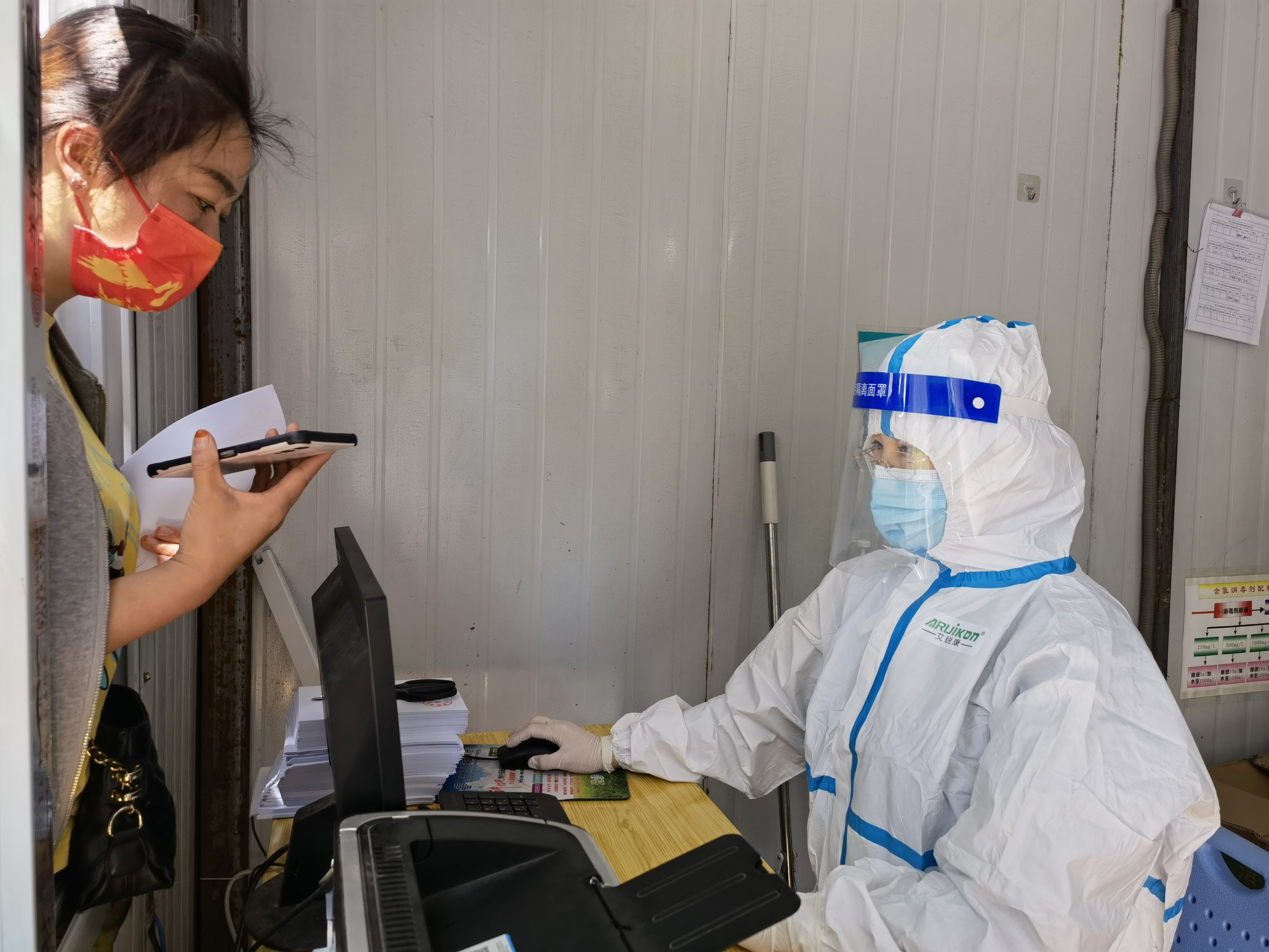 5月4日,記者在周口東新醫(yī)院核酸檢測(cè)點(diǎn)見到了全副“武裝”的王琳,她坐在核酸檢測(cè)點(diǎn)的核酸檢測(cè)報(bào)告打印崗位上,身穿防護(hù)服,認(rèn)真細(xì)致為需要幫助的群眾打印報(bào)告。“大到車輛安排,小到口罩發(fā)放、體溫計(jì)調(diào)配等防護(hù)物資保障都要協(xié)調(diào)統(tǒng)籌,一刻也不能停歇,我就想著別有什么地方落下了。安排好一切后,我回到醫(yī)院,同事們都前往全員核酸檢測(cè)一線了,這里人手不太足,我頂上。做好后勤保障工作,解決一線醫(yī)護(hù)人員的后顧之憂是我的責(zé)任和義務(wù)?!蓖趿照f。