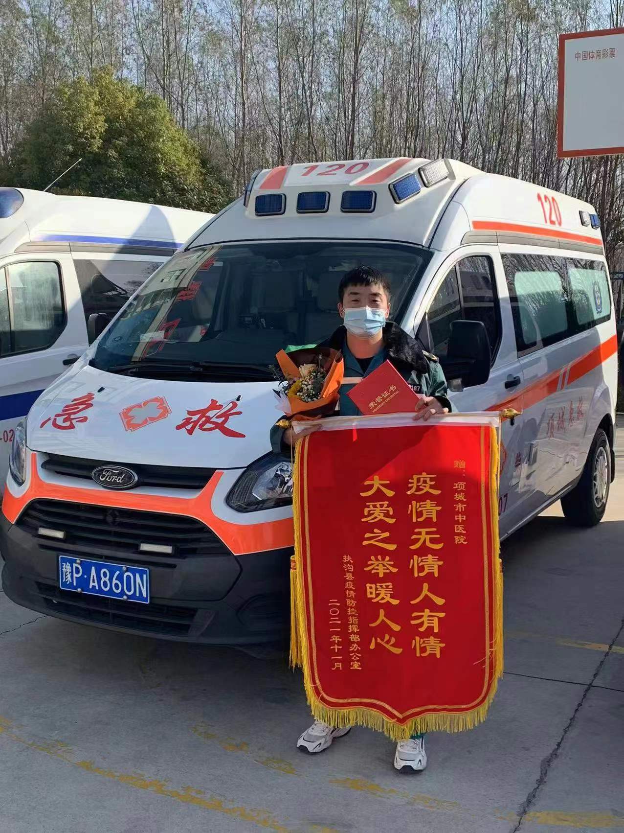 靳富壘,男,1993年人,他從2020年1月入職項城市中醫(yī)院救護車駕駛崗位,作為120救護車駕駛員,自新冠肺炎疫情阻擊戰(zhàn)打響以來,他就始終與醫(yī)護人員一起并肩作戰(zhàn),守好疫情防控的“第一道崗”。靳富壘每天大部分時間都在車上,接送患者、進出醫(yī)院大門都需要用消毒液對車輛內外進行消殺,雖然穿著防護服、戴著口罩,但每天幾十次地來回噴灑,也會對身體造成一定的影響。靳富壘平日積極樂觀、身體健壯,他說:“做好防護措施就好,我們的工作就是這樣,要說一點不怕那肯定是假的,但當時那個情景,既然我能派上用場,我肯定要上!”