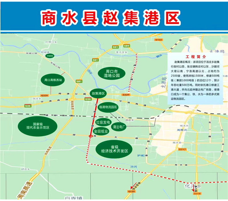 2017年,商水縣政府按照前瞻30年、謀劃15年、做實(shí)近5年工作要求,開始規(guī)劃修建位于湯莊鄉(xiāng)趙集行政村以西,張莊鎮(zhèn)韓莊村以東,沙潁河大堤以南,寧洛高速以北的趙集作業(yè)區(qū)。規(guī)劃建設(shè)占地約720畝、總投資6.37億元的趙集港項(xiàng)目,同時(shí)修建12個(gè)1000噸級(jí)泊位,其中散貨泊位8個(gè),通用泊位2個(gè),多用途泊位2個(gè),占用岸線1250米,預(yù)計(jì)年吞吐量達(dá)475萬噸。碼頭采用順岸式布置,結(jié)構(gòu)采用重力式扶壁結(jié)構(gòu),前沿配置30噸門座式固定吊裝卸作業(yè)。港口涵蓋貨物拆解區(qū)、散件堆放區(qū)等4個(gè)功能區(qū),集裝箱露天堆場、大型貨車停車場等5個(gè)場地。圍繞趙集港,高標(biāo)準(zhǔn)規(guī)劃建設(shè)占地約6.2平方公里的多式聯(lián)運(yùn)臨港經(jīng)濟(jì)園區(qū),下設(shè)金田紙業(yè)、建材倉儲(chǔ)兩個(gè)物流園區(qū),涵蓋建材及建材制品園區(qū)、造紙業(yè)原料及成品園區(qū)、紡織服裝原料及成品園區(qū)3個(gè)功能園區(qū)。該項(xiàng)目建成投入使用后,不但能加快商水縣紡織園區(qū)、循環(huán)園區(qū)、經(jīng)濟(jì)開發(fā)區(qū)、隆達(dá)電廠等企業(yè)物質(zhì)的流轉(zhuǎn),而且能使商水港成為周口沙潁河重要的鐵運(yùn)、陸運(yùn)、水運(yùn)交通樞紐、貨物貿(mào)易和物流中轉(zhuǎn)聚集區(qū),從而進(jìn)一步促進(jìn)商水經(jīng)濟(jì)的健康、快速發(fā)展。