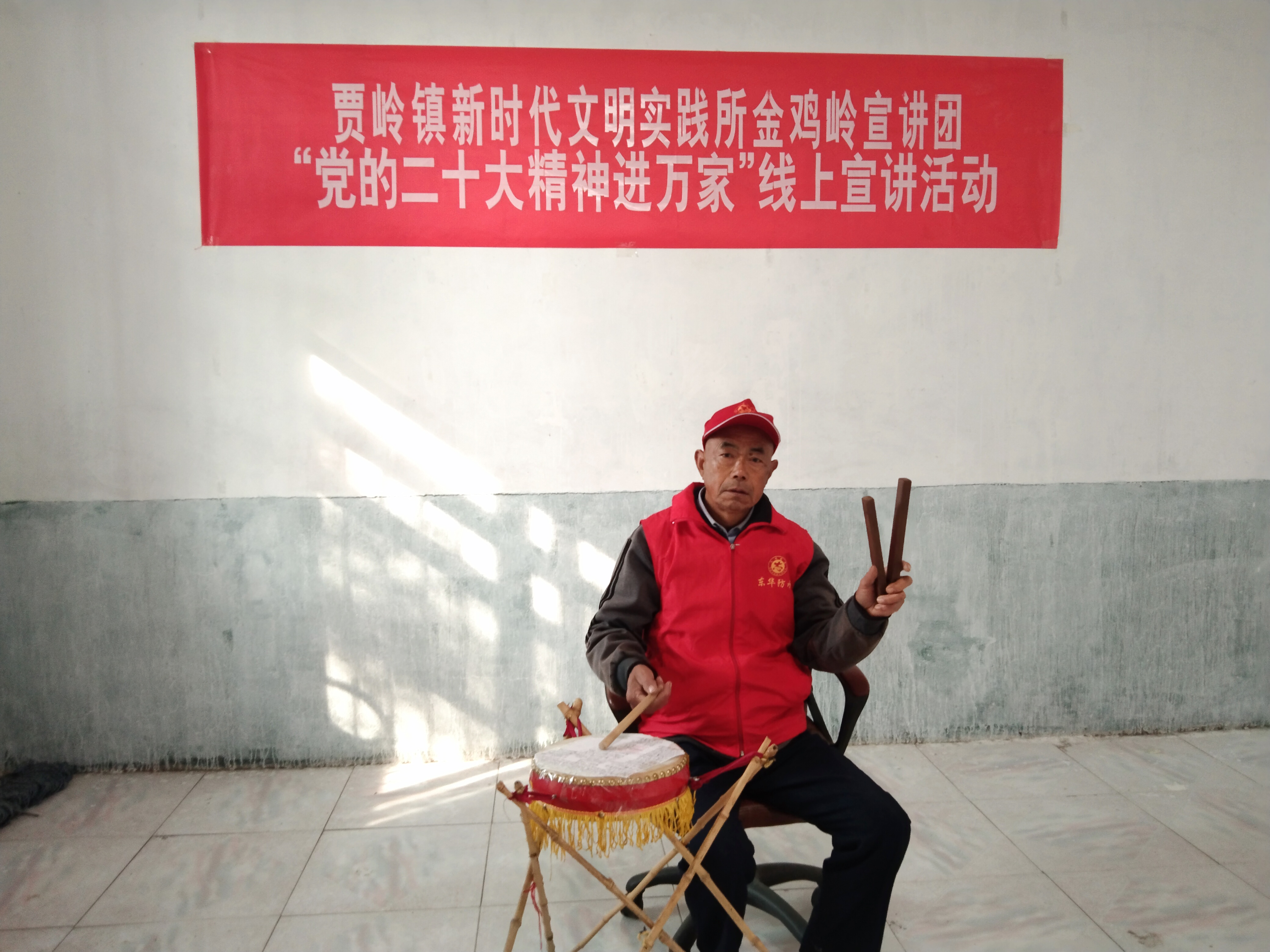 近日,項城市賈嶺鎮(zhèn)新時代文明實踐所金雞嶺宣講團志愿者、七旬老人閆汝才閑暇就會坐在一張凳子上,一手敲鼓、一手夾板,配合唱腔、道白,利用非遺“大鼓書”藝術表演形式,通過抖音平臺在線上宣傳黨的二十大精神。