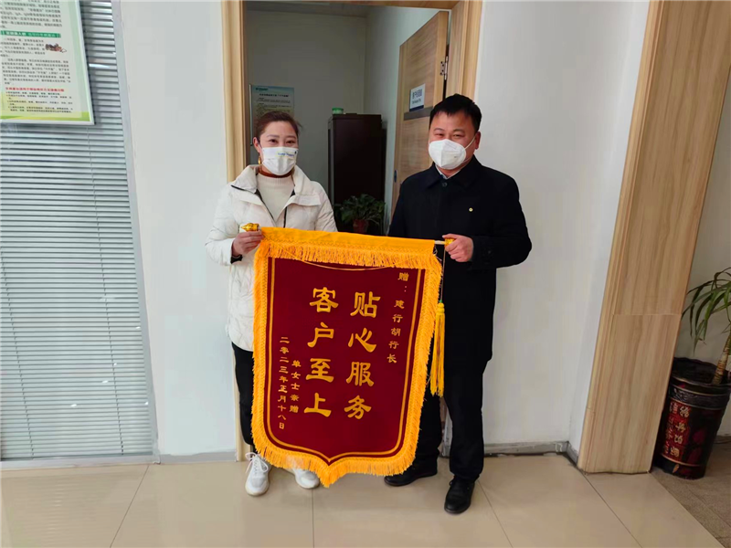“項(xiàng)城蓮花大道支行的工作人員服務(wù)熱情,辦事靠譜,處處為我們著想,錢存在這里,我十分放心!”2月12日,項(xiàng)城市單女士為建行周口分行項(xiàng)城蓮花大道支行送來一面寫有“客戶至上 貼心服務(wù)”的錦旗, 對(duì)蓮花大道支行全體工作人員的熱情高效、認(rèn)真負(fù)責(zé)的工作態(tài)度表示認(rèn)可和感謝。單女士十分感激地把錦旗遞給了項(xiàng)城蓮花大道支行負(fù)責(zé)人胡洋洋,并為其點(diǎn)贊。