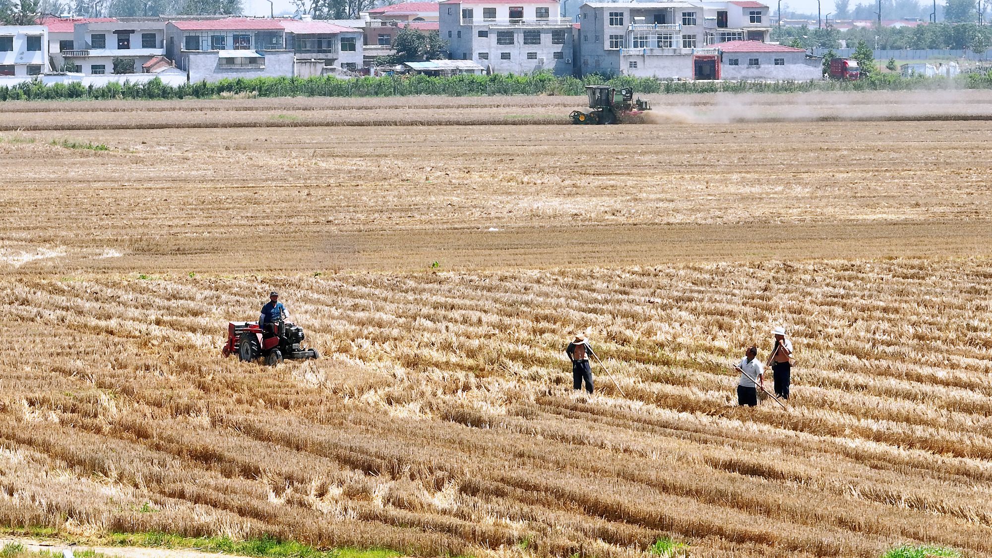 5月31日下午3時(shí)許,在許灣辦事處大張行政村村民田地里,收割機(jī)、點(diǎn)播機(jī)、拖拉機(jī)等農(nóng)用機(jī)械來(lái)往穿梭,村民手拿簸箕、木锨、掃帚等工具等待在地頭邊,收割下來(lái)的麥子被迅速攤開(kāi)在道路上,方便晾曬。“俺村一共110多畝地今天就能收完,2天就能曬干,壓在心口上的大石頭可算落了地?!笔痉秴^(qū)許灣辦事處大張行政村村民鄭乃福說(shuō)。