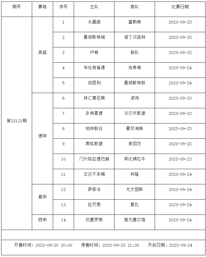 傳統(tǒng)足彩第23121期的賽事主要由英超、德甲、意甲和西甲組成。五大聯(lián)賽激戰(zhàn)正酣,豪門球隊(duì)都參加了周中的歐戰(zhàn),一周雙賽對(duì)于球隊(duì)體能有著不小的影響。其中曼城、曼聯(lián)、拜仁和巴薩等豪門都入選了本期足彩,他們能否全取三分我們一起來分析。