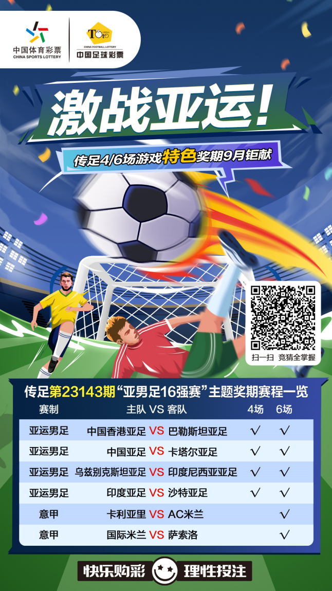 第23143期傳足特色獎期,已于9月26日12:00開售,將于9月27日19:00停售,9月29日開獎。其中沙中國香港亞足VS巴勒斯坦亞足、中國亞足VS卡塔爾亞足、烏茲別克斯坦亞足VS印度尼西亞亞足、印度亞足VS沙特亞足為4場進(jìn)球游戲競猜賽事。