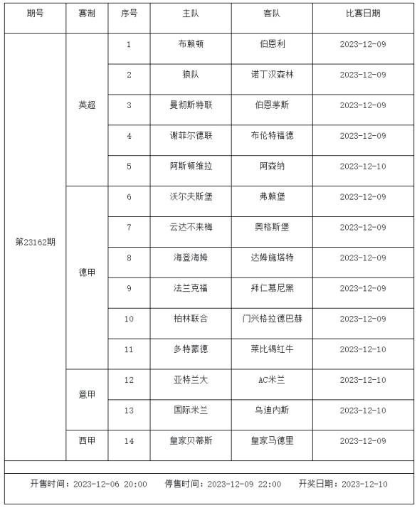 足球彩票勝負(fù)游戲(14場(chǎng)和任選9場(chǎng))第23162期賽程: