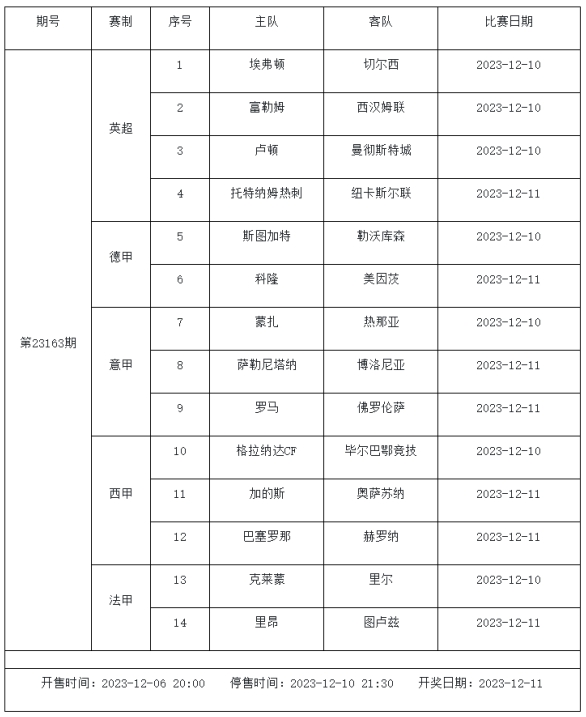 足球彩票勝負(fù)游戲(14場(chǎng)和任選9場(chǎng))第23163期賽程: