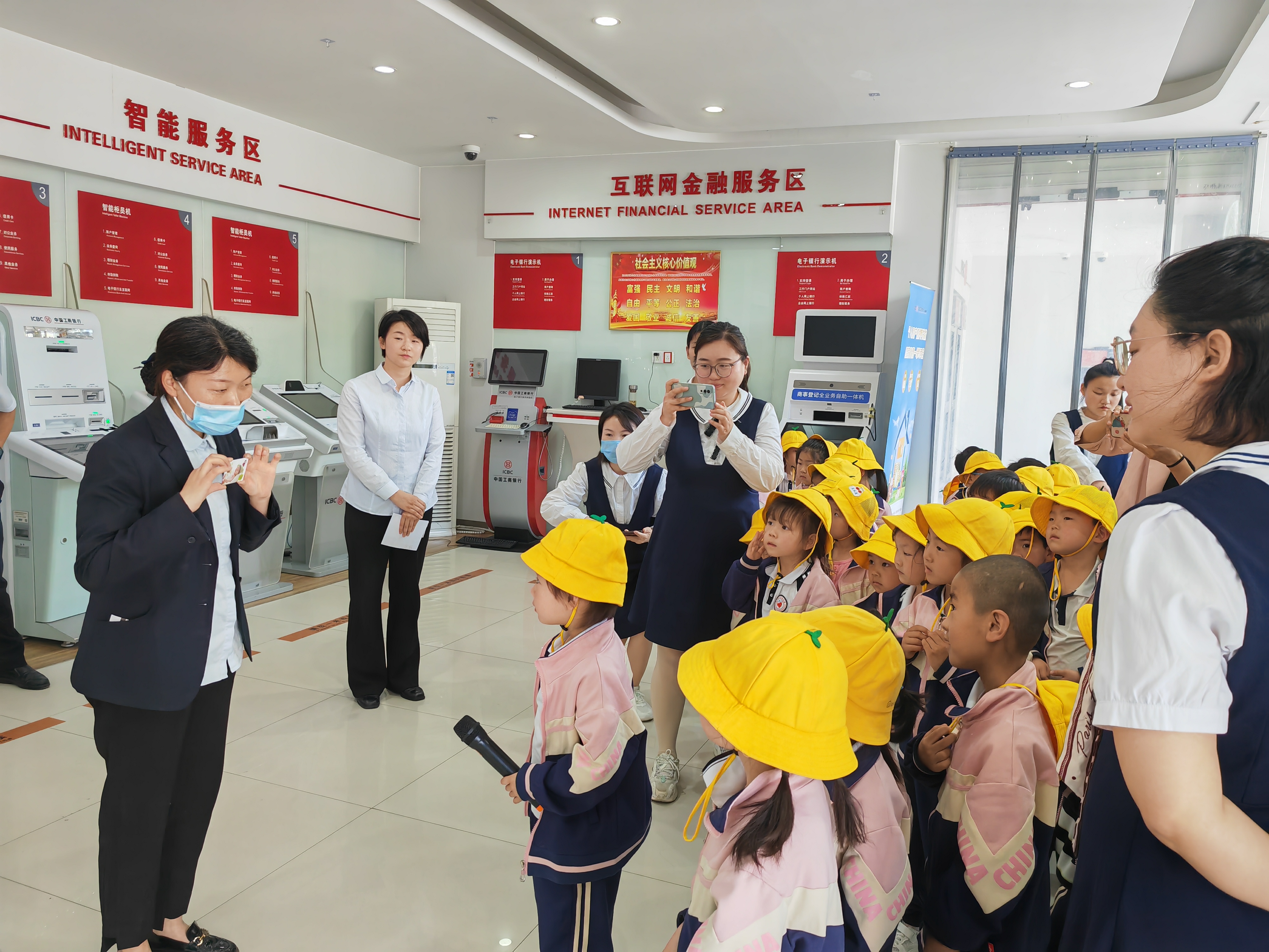 小朋友們在參觀營業(yè)網(wǎng)點(diǎn)中,該行工作人員為孩子們講解取號機(jī)、業(yè)務(wù)咨詢臺(tái)、服務(wù)窗口、自動(dòng)存取款機(jī)功能,簡要介紹辦理銀行業(yè)務(wù)流程,并對孩子們提出的問題一一解答。