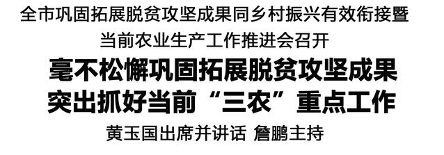 本報(bào)訊(記者 王艷) 11月10日,全市鞏固拓展脫貧攻堅(jiān)成果同鄉(xiāng)村振興有效銜接暨當(dāng)前農(nóng)業(yè)生產(chǎn)工作推進(jìn)會(huì)召開,對(duì)鞏固拓展脫貧攻堅(jiān)成果、抓好當(dāng)前農(nóng)業(yè)生產(chǎn)工作進(jìn)行再動(dòng)員再部署。市委書記黃玉國(guó)出席并講話。市長(zhǎng)詹鵬主持。