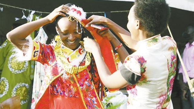 11月10日,學(xué)生在盧旺達(dá)卡永扎試穿中國服飾?!?a href="http://www.yijiaxihu.com/content/2021-11/13/content_959142.html" target="_blank" >[詳細(xì)]