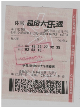 10月30日,體彩大樂透第23124期開獎。當(dāng)期開獎號碼為前區(qū):06、18、23、27、32,后區(qū):06、10。位于周口市西華縣4116220094體彩實體店傳出喜訊,購彩者馬先生喜中大樂透二等獎,斬獲獎金9.6萬元?!?a href="http://www.yijiaxihu.com/content/2023-11/20/content_1036092.html" target="_blank" >[詳細(xì)]