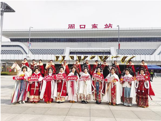 2月9日,身著漢服的舞蹈演員在高鐵周口東站廣場(chǎng)上帶來靈動(dòng)的快閃表演,傳遞周口文化韻味。