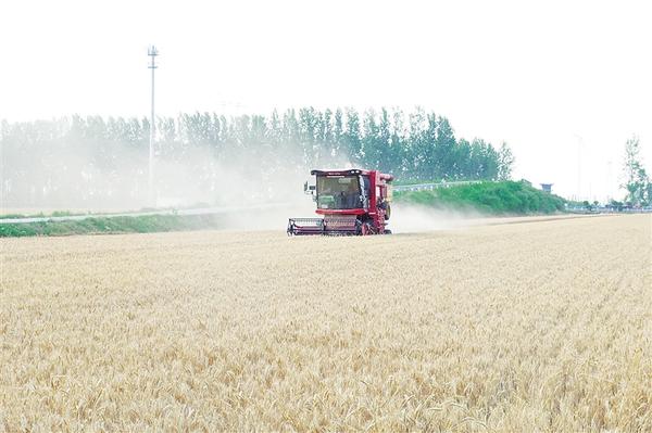 5月26日,在川匯區(qū)華耀城街道葛灣行政村的麥田里,農(nóng)機(jī)手駕駛農(nóng)機(jī)搶收小麥。