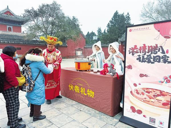 1月26日,游客排隊(duì)領(lǐng)取臘八粥。當(dāng)日,農(nóng)歷臘月初八,一場(chǎng)以“財(cái)神賜?!げ排钪唷す灿槿稹睘橹黝}的活動(dòng)在太昊陵景區(qū)太極門(mén)廣場(chǎng)精彩上演,為游客們帶來(lái)了一場(chǎng)沉浸式文化盛宴。
