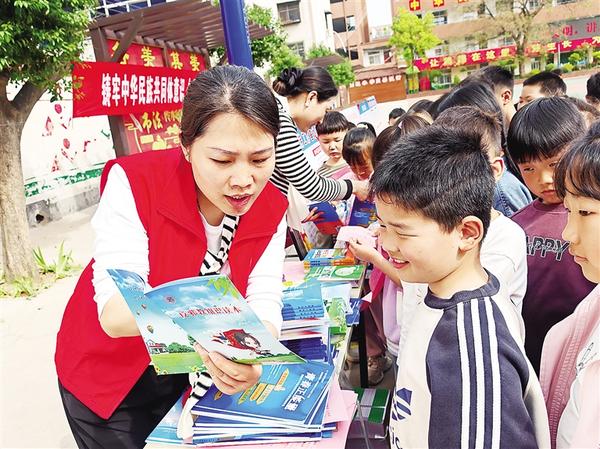 4月9日,志愿者向?qū)W生講解反邪教知識。當天,扶溝縣科協(xié)聯(lián)合縣委統(tǒng)戰(zhàn)部、縣民宗局、縣教體局開展“鑄牢中華民族共同體意識暨民族宗教政策法規(guī)宣傳月”活動,為回族小學師生送去科普圖書及宣傳物品2000余件。
