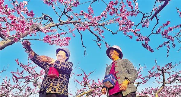 4月1日,扶溝縣固城鄉(xiāng)秦嶺行政村的一個(gè)桃園內(nèi),果農(nóng)正對(duì)桃花進(jìn)行人工輔助授粉,以提高坐果率,全力保豐收。