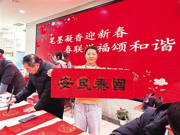 1月20日,扶溝縣政務服務中心一名工作人員展示剛收到的手寫春聯(lián)。連日來,我市數(shù)千余名書法家、書法愛好者為市民寫春聯(lián)、送“?!弊?,送上美好的祝福。