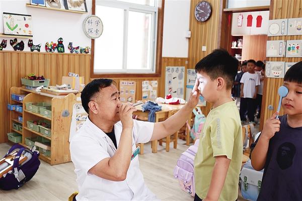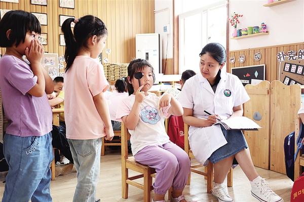 5月19日,扶溝縣中醫(yī)院眼科的醫(yī)護人員在扶溝縣直幼兒園為小朋友檢查視力。近日,為迎接即將到來的第30個全國“愛眼日”,扶溝縣多家幼兒園開展“愛眼護眼從小做起”主題活動,邀請醫(yī)務(wù)人員到校講解眼科知識和用眼衛(wèi)生常識,并為小朋友進行視力檢查,引導其養(yǎng)成正確用眼習慣。