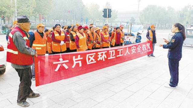 項(xiàng)城市城管局六片區(qū)負(fù)責(zé)人為環(huán)衛(wèi)工人講解安全知識