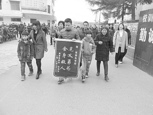 本報(bào)訊 (記者 朱紅 文/圖)3月7日本報(bào)以《姜振英:冰河救起雙胞胎》為題報(bào)道了沈丘縣縣直高中教師姜振英冰河勇救落水雙胞胎的英勇事跡。昨日上午,沈丘縣縣直高中鑼鼓喧天、格外熱鬧。在鑼鼓聲中,得救孩子和親屬一起將一面寫(xiě)有“見(jiàn)義勇為 舍身救人”的錦旗送到姜振英手中。