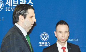 3月10日,在韓國首爾,美國駐韓國大使馬克·利珀特(左)在出院前出席記者會。當地時間5日上午,利珀特在出席首爾世宗文化會館舉行的活動時,被一名韓國男子用刀劃傷,襲擊嫌疑人被當場抓住。