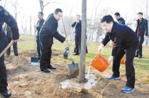 3月12日,皇甫立新等在植樹(shù)點(diǎn)植樹(shù)。當(dāng)日,沈丘縣四個(gè)班子領(lǐng)導(dǎo)來(lái)到縣城東環(huán)路綠化帶植樹(shù)點(diǎn),與當(dāng)?shù)厝罕娨黄饟]鍬鏟土,參加義務(wù)植樹(shù)活動(dòng)。(記者 韋偉 通訊員 艾長(zhǎng)青)