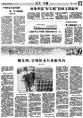 眼下,他正在做一個新型施工體系的示范、推廣工作。這個施工體系簡而言之,就是用新型的非固化膠體粘合防水材料,直接鋪在施工面上,一改過去用噴槍粘合的方式,省工省時,防水效果更佳?!斑@個體系做好了,將徹底改變以往的防水工藝?!蔽簴|鴻對此極有信心。