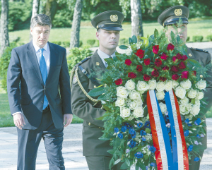 ⑤5月9日,在克羅地亞首都薩格勒布,克總理米拉諾維奇(左)在紀念反法西斯戰(zhàn)爭勝利70周年的活動中向人民英雄紀念碑敬獻花圈。新華社發(fā)