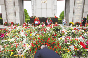 ?、?月9日,一名男子在德國柏林一處蘇軍烈士墓獻花。
