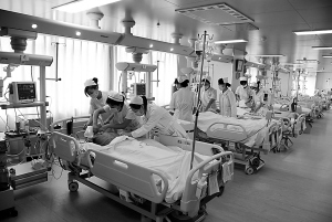 5月4日上午8點(diǎn)45分,記者走進(jìn)了周口市中醫(yī)院綜合病房樓七樓的重癥醫(yī)學(xué)科(即ICU病房),護(hù)士長徐亞鵬熱情地接待了我們。在徐亞鵬的介紹下,我們親眼目睹了重癥醫(yī)學(xué)科內(nèi)病人的各種反應(yīng)。當(dāng)天病人不太多,10個(gè)床位只有7個(gè)病人,其中有產(chǎn)后大出血的、有肝癌晚期的、有有機(jī)磷農(nóng)藥中毒的……幾乎每個(gè)人都上著呼吸機(jī)。身著紫色護(hù)士服的“天使”們在各種儀器和各個(gè)危重病人間來回穿梭。