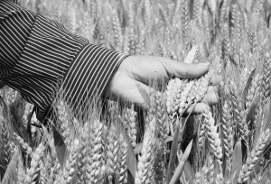 5月26日,河北省河間市孫莊村農(nóng)民在麥田里查看小麥長(zhǎng)勢(shì)。