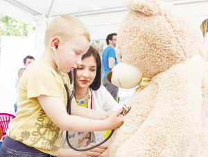 5月30日,在克羅地亞首都薩格勒布,一名男孩在“泰迪熊醫(yī)院”為他的毛絨玩具“聽(tīng)診”。這一活動(dòng)的主要目的是消除孩子們對(duì)醫(yī)生和醫(yī)院的恐懼。