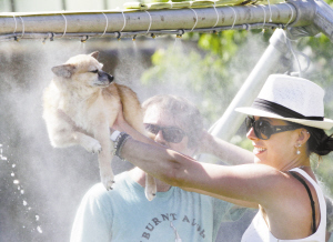熱浪襲擊溫哥華 6月27日, 在加拿大溫哥華, 一名女子利用街頭的噴水設(shè)施為寵物狗降溫。據(jù)加拿大環(huán)境部門檢測,不列顛哥倫比亞省沿岸地區(qū)當(dāng)日最高氣溫達攝氏三十度,內(nèi)陸地區(qū)升至四十度。溫哥華市政府已發(fā)出高溫預(yù)警,呼吁民眾外出時注意身體狀況,謹(jǐn)防中暑。新華社發(fā)
